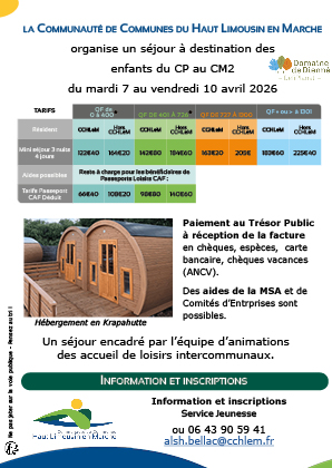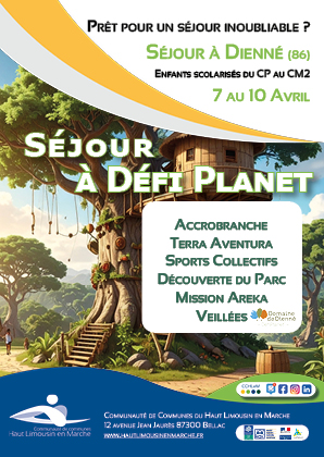 La Communauté de Communes du Haut Limousin en Marche organise un mini-séjour à destination des enfants scolarisés du CP au CM2, du mardi 7 au vendredi 10 avril 2026, à Dienné (86), au parc DéfiPlanet’.